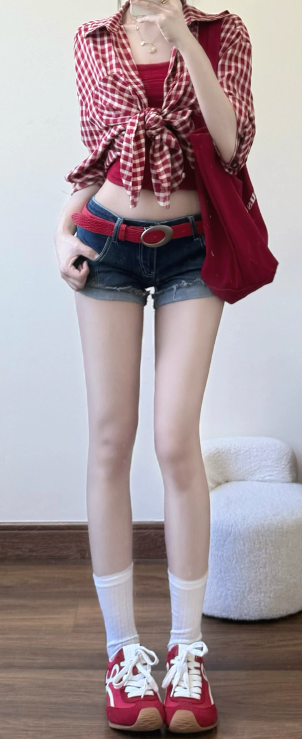 今天的ootd是一件红色短上衣和深蓝色牛仔短裙再配上一双红色的球鞋,翁杰说我这是甜酷风。