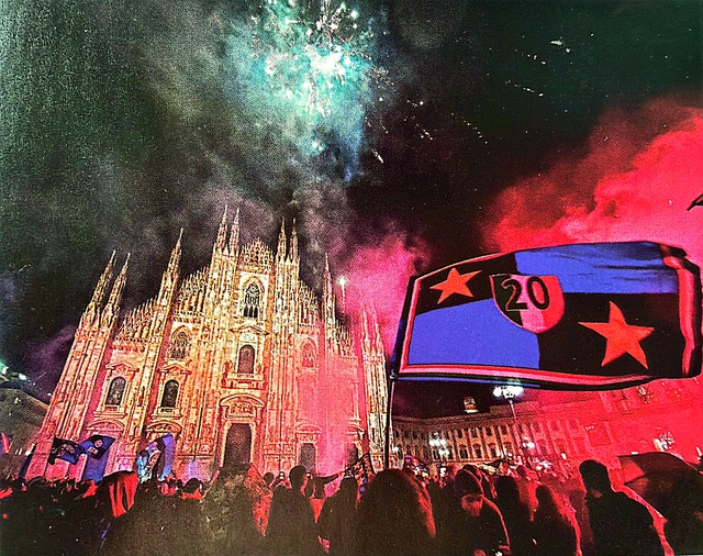 4月22日,米兰德比国际米兰二比一击败AC米兰提前夺得意甲冠军赛后蓝黑球迷很快通向米兰大教堂广场燃放烟花庆祝。