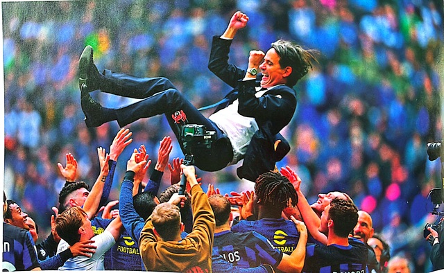 4月28日,国际米兰主场二比零击败都灵,赛后球员们将小因扎吉高高抛起欢庆庆祝这一款蓝黑主帅居功至伟。