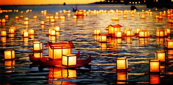 许完愿后,睁开眼睛看着河灯渐渐飘远